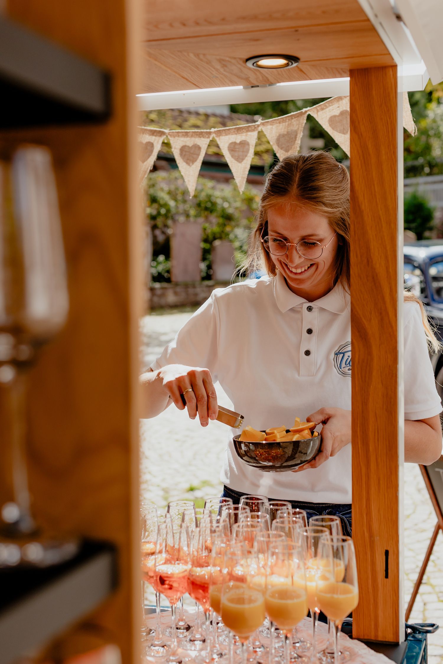 Von Aperol bis hin zu Toppings für den Sekt (Orangen, Himbeeren, Minze etc.) kümmern wir uns um alles was Dein Herz begehrt.